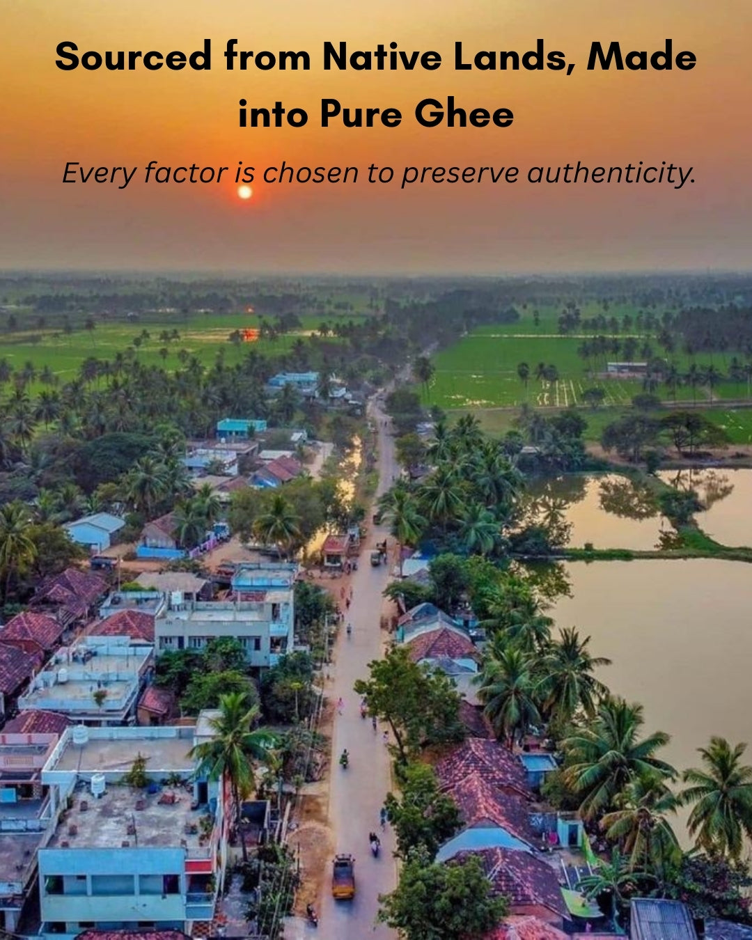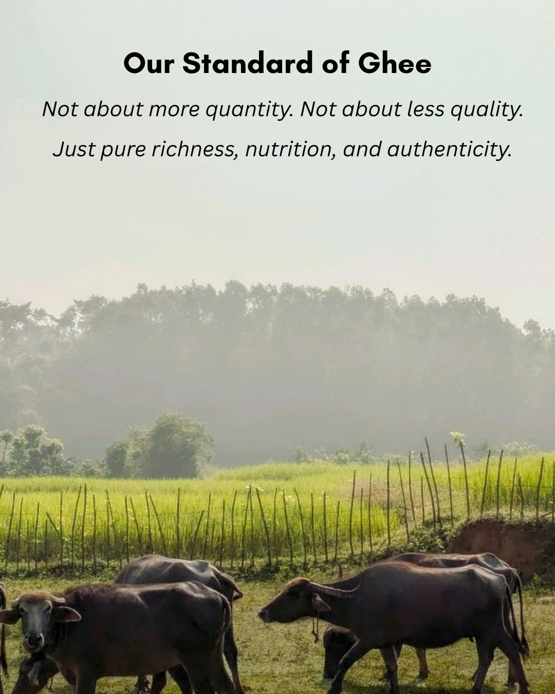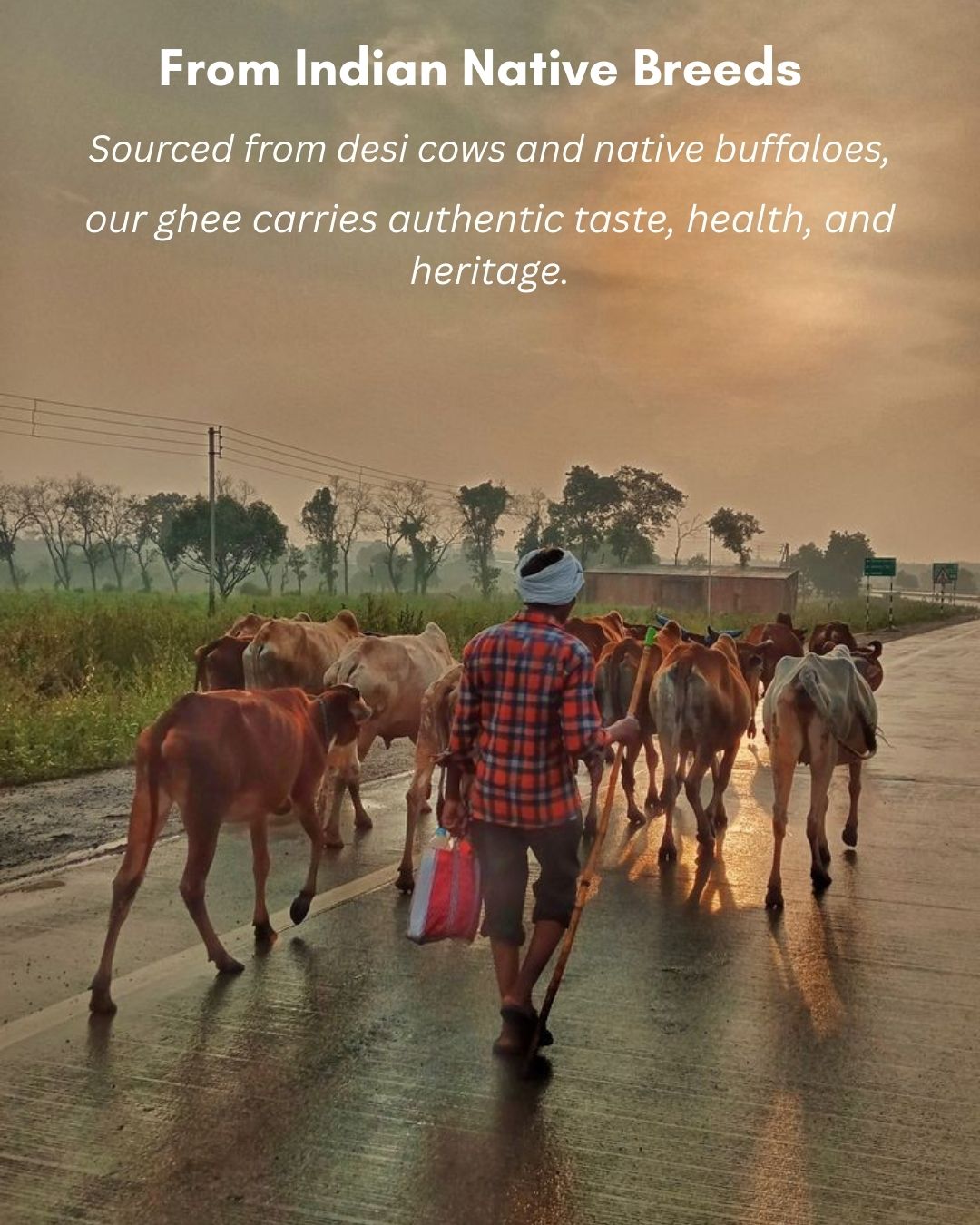 We source rich milk from Indian native cows and buffaloes, raised in natural surroundings. This pure milk is the foundation of our ghee, carrying the richness of tradition and nutrition.