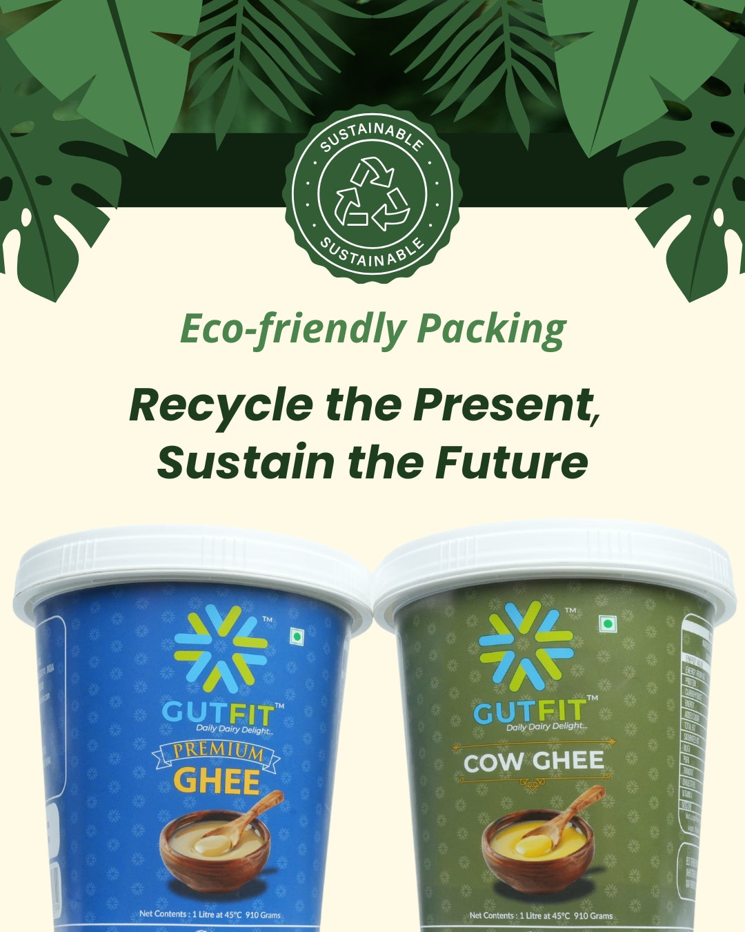 Our pure Cow and Buffalo Ghee is not only crafted with care but also delivered responsibly in eco-friendly packs. By choosing GUTFIT Ghee, you enjoy authentic nutrition while supporting a sustainable future for generations to come.
